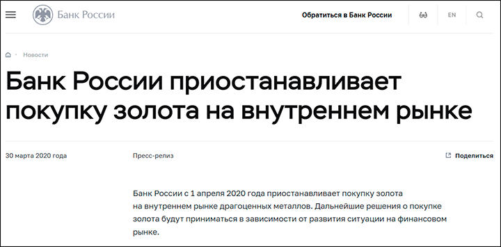 "Банк России не закупал золото с 2020 года". Скриншот: сайт ЦБ РФ