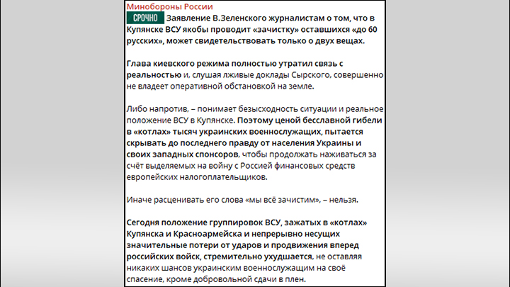 Реакция Минобороны России на ложь Зеленского о положении дел в Купянске и Красноармейске, скриншот страницы