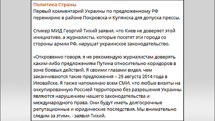 Украинский телеграмм-канал "Политика страны" о реакции Киева на инициативу Владимира Путина приехать западным СМИ в Покровск и Купянск. Скриншот страницы