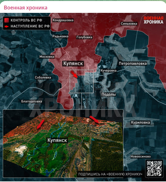 По информации противника, на Купянском направлении наши войска продвинулись на территорию комбината Хлебопродуктов. На западном берегу Оскола ВС России с боями продвигаются в застройке. В центре города русские бойцы заняли несколько зданий в высотной застройке у берега Оскола, а передовые отряды штурмовиков замечены уже на самом юге города — в районе развязки к Садовому.