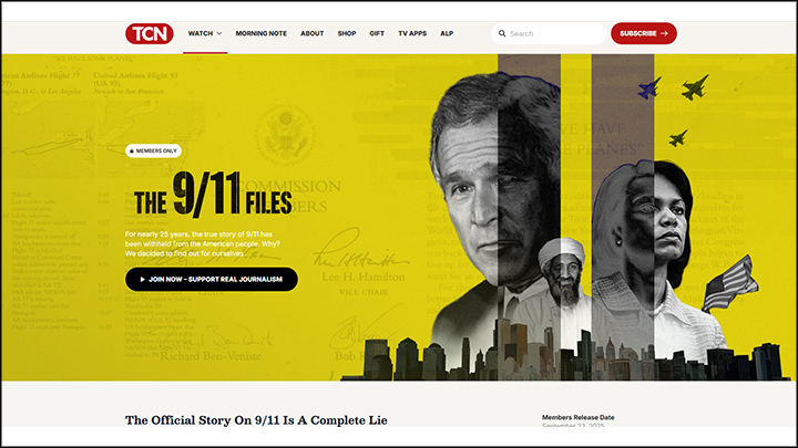 "Официальная версия — ложь! Почти 25 лет американскому народу не рассказывали правду о событиях 11 сентября", — утверждает Такер Карлсон в анонсе цикла передач, посвящённых теракту 9/11. Скриншот: tuckercarlson.com