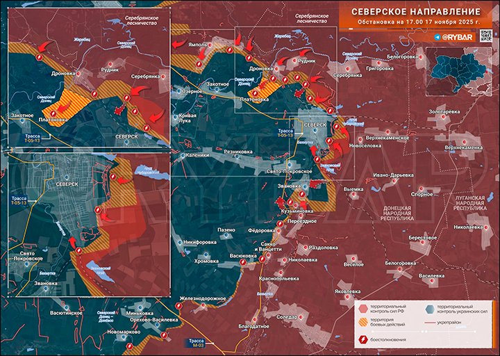 Резко ускорились события в районе Лимана (Красного Лимана) и Северска – то есть на правом фланге, где у нас с 2023 года были минимальные продвижения. В четверг, 20 ноября, стало известно, что наши подразделения зашли на окраину города – второе сражение за освобождение Лимана началось.
