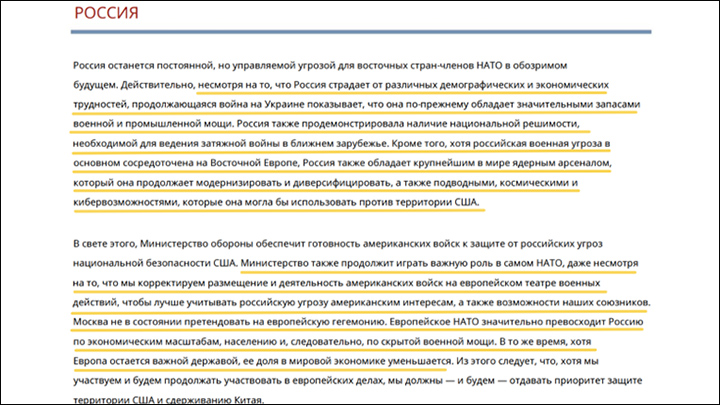 Так вот та, что была разработана восемь лет назад, оценивала степень угрозы России для США на одном уровне с КНР. Там указывалось, что главным вызовом для Северной Америки является "стратегическая конкуренция со стороны стран, которые Национальная стратегия безопасности классифицирует как ревизионистские державы". И отмечалось: "Китай и Россия стремятся сформировать мир, соответствующий их авторитарной модели". То есть мы позиционировались там как стратегический конкурент, который представляет собой масштабную угрозу. Хотя в том документе (на 14 страниц) Россия упоминалась только 6 раз.