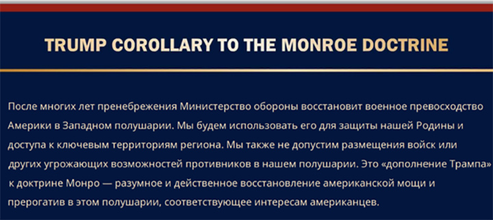 Собственно, эта мысль проходит через весь 26-страничный текст – как и совершенно нескрываемое восхваление главного американского босса и его результатов за первый год нового срока в президентском кресле. В первой же части указано, что Пентагон гарантирует своей стране "военный и коммерческий доступ США к ключевым территориям, особенно к Панамскому каналу, Американскому заливу и Гренландии". И военные готовы, хоть и обещают добросовестно взаимодействовать с соседями, в случае чего, заставить последних уважать их интересы и "предпринять целенаправленные и решительные действия":