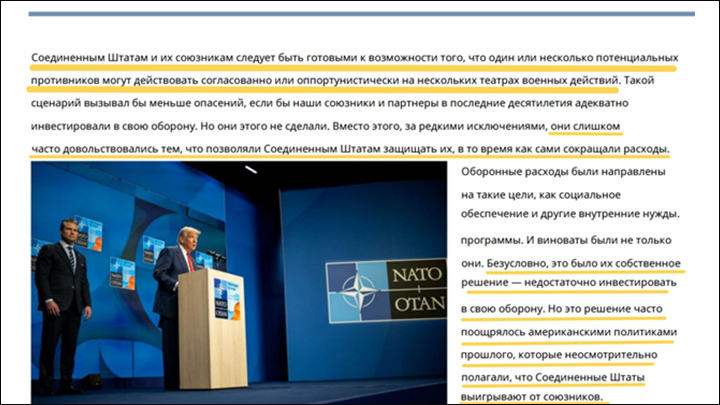 Документ, продолжает он, можно охарактеризовать как "прагматичный эгоизм". Одна из главных его задач – перекладывание бремени мировых расходов на оборону: финансовых, человеческих, промышленных – на "партнёров США". В первую очередь на Европу, но не только. Например, часть нагрузки падает и на Южную Корею – в вопросе противостояния КНДР.