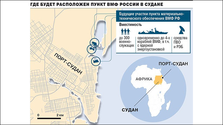 Соглашение на этот счёт, пока не ратифицированное, рассчитано на 25 лет. Оно предусматривает, что на базе могут находиться максимум четыре корабля и личный состав численностью не более 300 человек. За это "удовольствие" Россия будет поставлять Хартуму – официальным властям разваливающейся, вернее, разваливаемой страны, в прокси-войне на территории которой, действуя в собственных интересах друг против друга, принимают участие с десяток иностранных государств, – военную технику и вооружения.