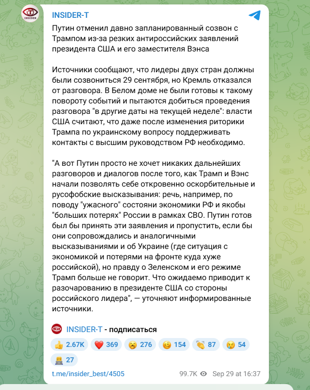 29 сентября должны были-де состояться телефонные переговоры между президентами США и России. Темой для обсуждения были неосторожные слова Джей Ди Вэнса о том, что Украина может получить американские ракеты "Томагавк" для ударов по территории России.
