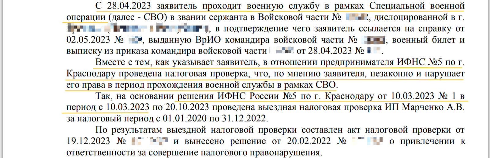 Впрочем, наладить дела это особо не помогло. В октябре уже 2024 года Арбитражный суд Краснодарского края отказал Андрею Марченко в удовлетворении его иска, где он педалировал именно тему незаконности проверки ввиду прохождения им военной службы по контракту в рамках СВО: