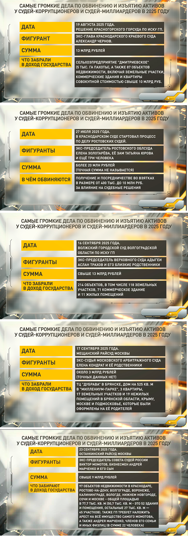 Уже после похорон Подносовой, когда место главы ВС оставалось вакантным, произошёл ряд знаковых событий, связанных с коррумпированными судьями, которые, вероятно, и предопределили имя нового председателя Верховного суда. Благодаря искам Генпрокуратуры в доход государства удалось изъять имущество проворовавшихся судей на общую сумму более 30 миллиардов рублей. И это всего за пару месяцев (см. карточки инфографики ниже).