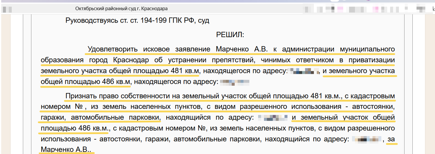 Второе (2017 г.) — о легализации недостроя, который Марченко выкупил у другой фирмы, но забыл поставить на учёт, в связи с чем мэрия Краснодара отказала ему в приватизации здания (после постановки на учёт надо платить налоги). И Октябрьский райсуд кубанской столицы... обязал признать право собственности и на здание, и на участок под ним за Андреем Марченко.