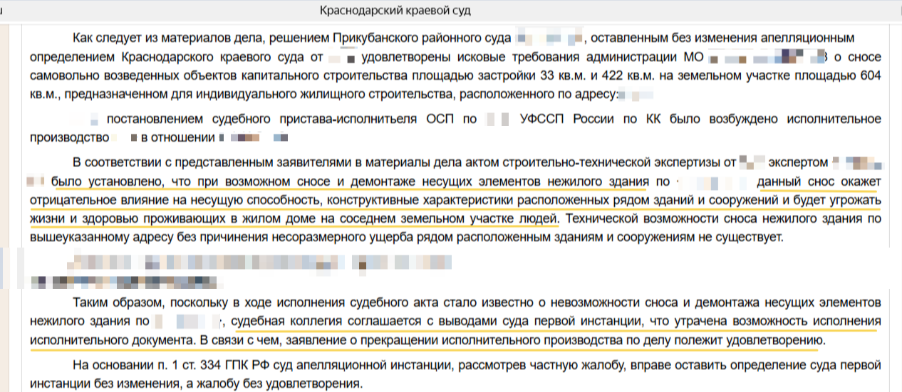 Первое (2016 г.) — об отказе исполнить решение Прикубанского райсуда о сносе самовольной постройки, возведённой как частный дом, но используемой в качестве отеля. Судебный пристав, занимавшийся исполнением, с внезапным интересом отнёсся к делу и по собственной инициативе привлёк экспертов, которые выяснили, что сносить гостиницу никак нельзя, поскольку это будет небезопасно для соседних зданий. И краевой суд согласился с инициативным сотрудником: