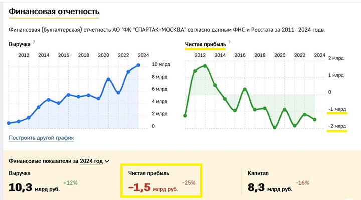 Столь солидные траты не окупаются с коммерческой точки зрения: за последние несколько лет "Спартак" принёс убытков на 10 млрд рублей.