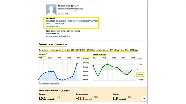 У ХК СКА крепкие связи с "Газпромом" — и скромные финансовые показатели. Коллаж Царьграда по материалам интернет-сайта checko.ru