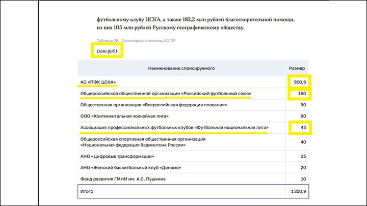 К слову, в годовом отчёте корпорации говорится лишь о совместном с ЦСКА проекте по развитию детского футбола. Есть информация вместе с тем, что в настоящее время ВЭБ выделяет ЦСКА примерно 700 млн в год только за присвоение стадиону названия "ВЭБ Арена".