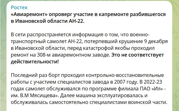 "Авиаремонт" опроверг участие в капремонте разбившегося в Ивановской области АН-22. В сети распространяется информация о том, что военно-транспортный самолет АН-22, потерпевший крушение 9 декабря в Ивановской области, перед катастрофой якобы проходил ремонт на 308-м авиаремонтном заводе. Это не соответствует действительности! Последний раз борт проходил контрольно-восстановительные работы с участием специалистов завода в 2007 году. В 2022-23 годах самолет обслуживался по программе филиала ПАО «Ил» - им. В.М Мясищева». Далее машина эксплуатировалась и обслуживалась самостоятельно специалистами воинской части,