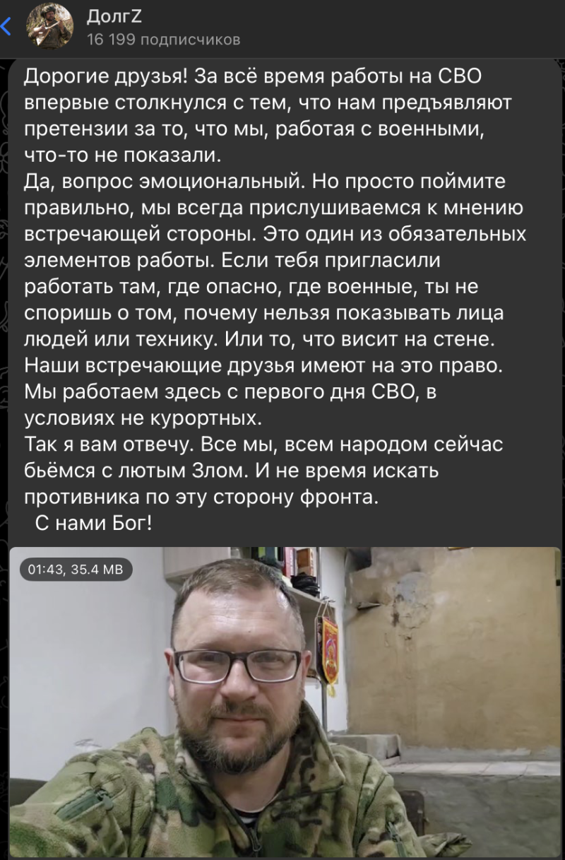 Военкор Николай Долгачёв, который вёл спорный репортаж, объяснил, что это первый случай, когда ему предъявили претензии за то, что не было показано что-то во время работы с военными. Он отметил, что работа в таких условиях требует уважения к мнению местных командиров и соблюдения их правил. Долгачёв подчеркнул, что все они сейчас противостоят "лютому злу" и не время искать противников внутри своей стороны фронта.