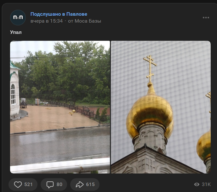 В Павлове штормовой ветер уронил крест с церковного купола, сообщили жители в социальной сети. Некоторые увидели в этом нехороший знак, другие - повод для шуток.